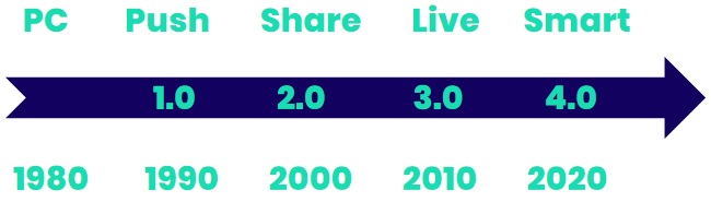In this stage the Internet is mostly company driven. They are ‘pushing’ their customers to go online, because they have published their brochure online. Mostly text based web. A lot to read, less to see. Websites are born in this stage. Different computer languages are developed. Like JavaScript or html.